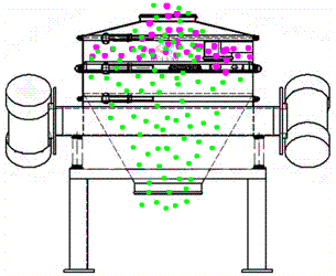 直排篩的兩臺振動電機對稱安裝在其兩側,振動電機上、下端裝有偏心重錘將振動電機的旋轉運動變為水平、垂直、傾斜以及離心作用的多作用力重疊,再將這種作用力傳遞給篩面,用戶可以通過改變上下偏心塊的相位角和重量,進而改變激振力的大小和物料的運動軌跡,達到篩分的目的。