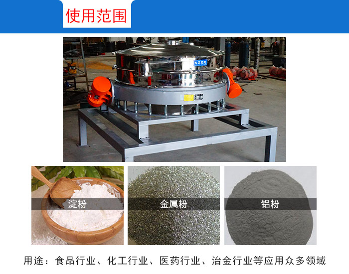 適用物料:面粉、淀粉、洗衣粉、金屬粉、添加劑、化工、非礦等行業的顆粒、粉末的粗略篩分。