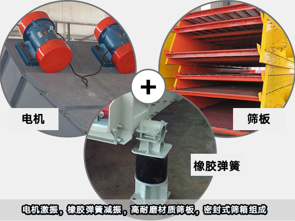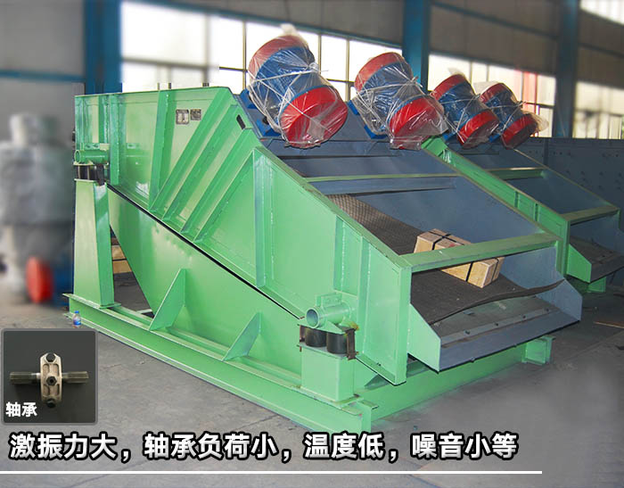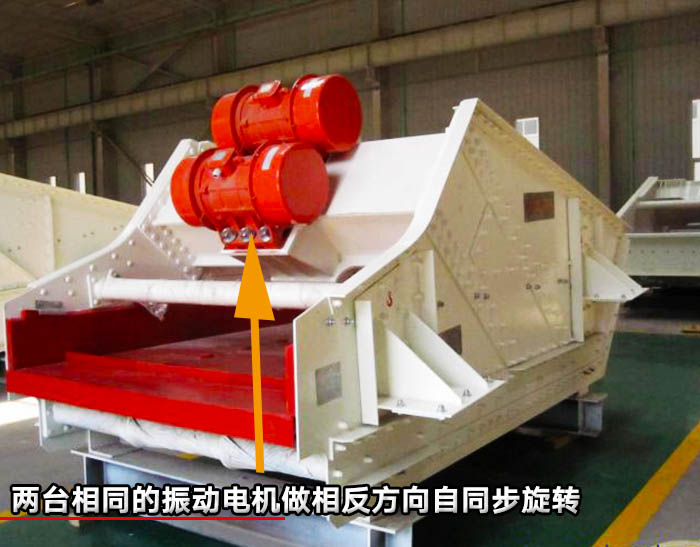 篩機(jī)利用兩臺相同的振動電機(jī)做相反方向自同步旋轉(zhuǎn),使支承在減振器上的整個篩機(jī)做直線振動,物料從入料端落入篩箱后,迅速前進(jìn),松散,透網(wǎng),完成篩分作業(yè)。