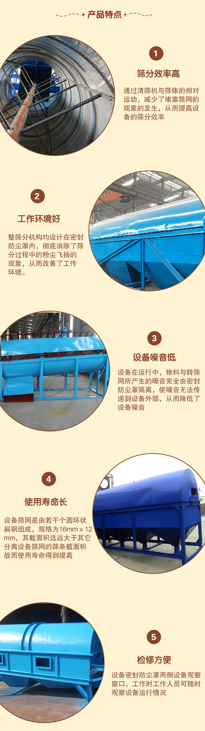 3,設備噪音低,設備在運行中,物料與轉(zhuǎn)篩網(wǎng)所產(chǎn)生的噪音完全由密封防塵罩隔離,使噪音無法傳遞到設備外部,從而降低了設備噪音。