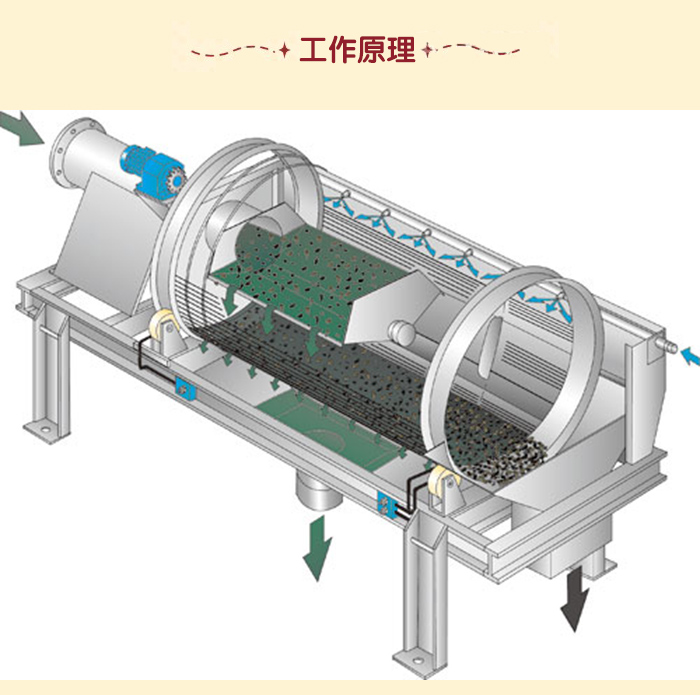 當物料進入滾筒裝置后,由于滾筒裝置的傾斜與轉(zhuǎn)動,使篩面上的物料翻轉(zhuǎn)與滾動,使合格物料(篩下產(chǎn)品)經(jīng)滾筒后端底部的出料口排出,不合格的物料(篩上產(chǎn)品)經(jīng)滾筒尾部的排料口排出。由于物料在滾筒內(nèi)的翻轉(zhuǎn)、滾動,使卡在篩孔中的物料可被彈出,防止篩孔堵塞。滾筒篩砂機、滾筒篩分機與滾筒篩的原理構造幾乎相同,是人們對它的認識和叫法上存在差異。