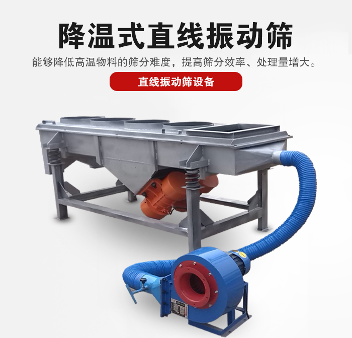 降溫式直線振動(dòng)篩又稱為風(fēng)冷式直線振動(dòng)篩,增加了風(fēng)機(jī)降溫冷卻系統(tǒng),可將高溫物料降溫后繼續(xù)篩分,能夠降低高溫物料的篩分難度,篩分效率、處理量也得到了大幅度的提高,節(jié)約生產(chǎn)成本。主要針對(duì)的是一些高溫物料的篩分,除雜以及分級(jí)的使用需求。