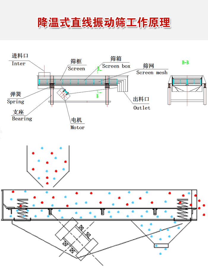 物料在進(jìn)入設(shè)備時(shí),位于進(jìn)料口底部或箱體下側(cè)端的風(fēng)機(jī)降溫冷卻系統(tǒng)對(duì)其進(jìn)行降溫作業(yè),兩臺(tái)振動(dòng)電機(jī)相對(duì)篩面有一傾角,在激振力和物料自重力的合理作用下,降溫后的物料在篩面上被拋起、跳躍式向前做直線運(yùn)動(dòng),通過多層篩網(wǎng)過濾不同規(guī)格的篩上物及篩下物,分別從各層的出料口排出,達(dá)到篩選和分級(jí)的目的。
