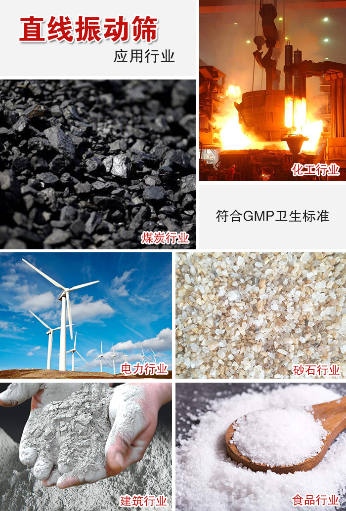 普通直線振動篩:適用于物料粒度在0.074-5mm,含水量小于70%且無粘性的各種干式粉狀或顆粒狀物料。