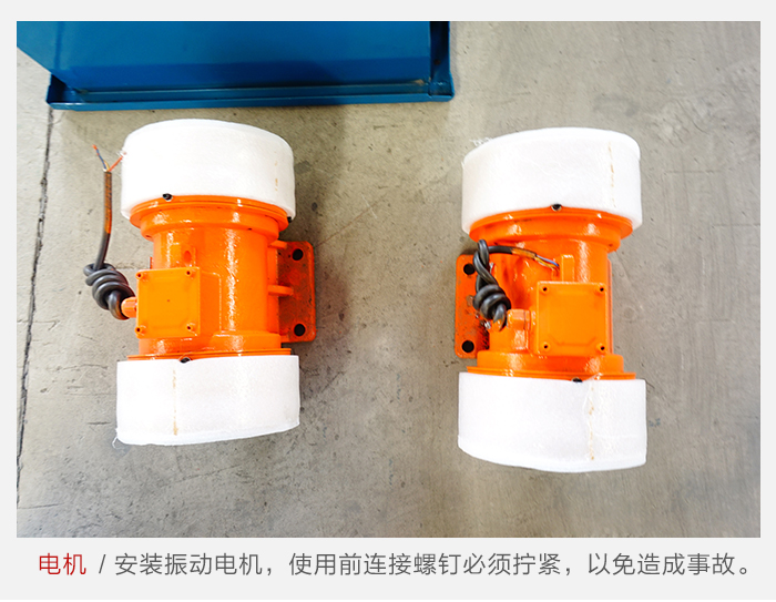 四、電機臺座:安裝振動電機,使用前連接螺釘必須擰緊,特別是新篩機試用前三天、必須反復緊固,以免松動造成事故。