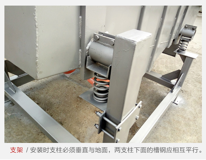 六、支架:由四個支柱和兩個槽鋼組成,支持著篩箱,安裝時支柱必須垂直與地面,兩支柱下面的槽鋼應相互平行。