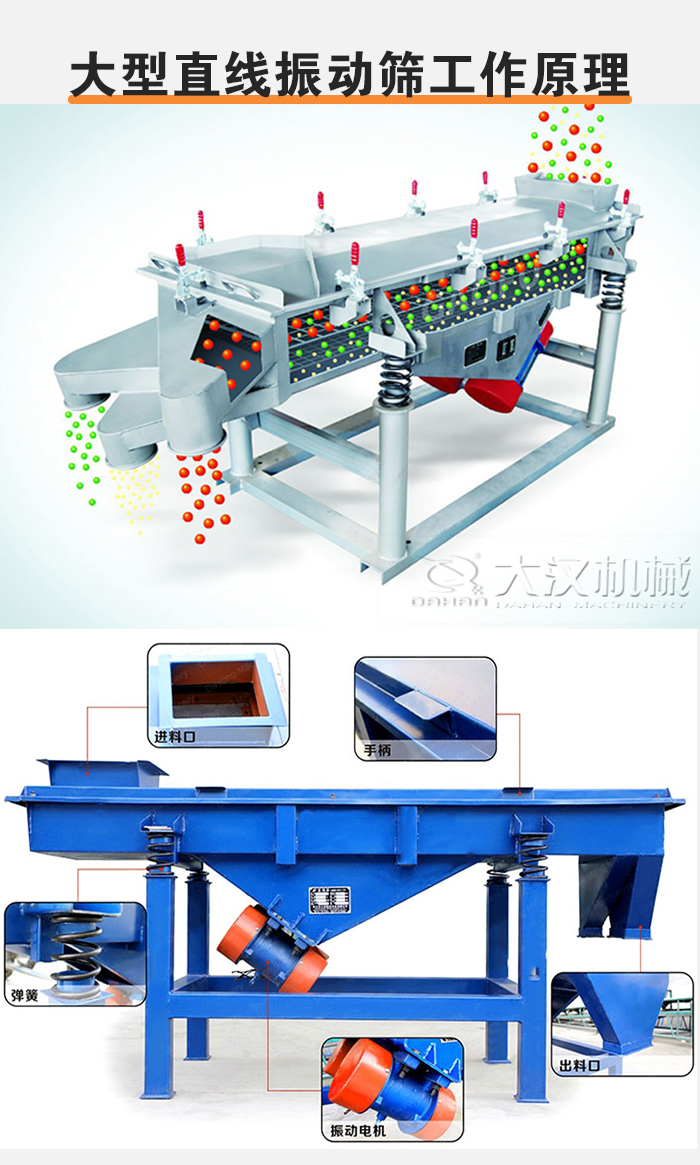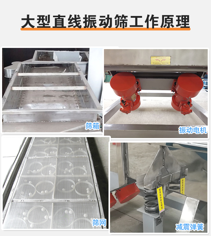 面粉直線振動篩由篩箱、篩框、篩網(wǎng)、振動電機、電機臺座、減振彈簧、支架等組成。