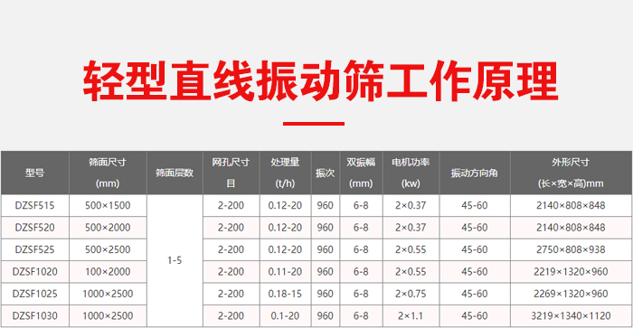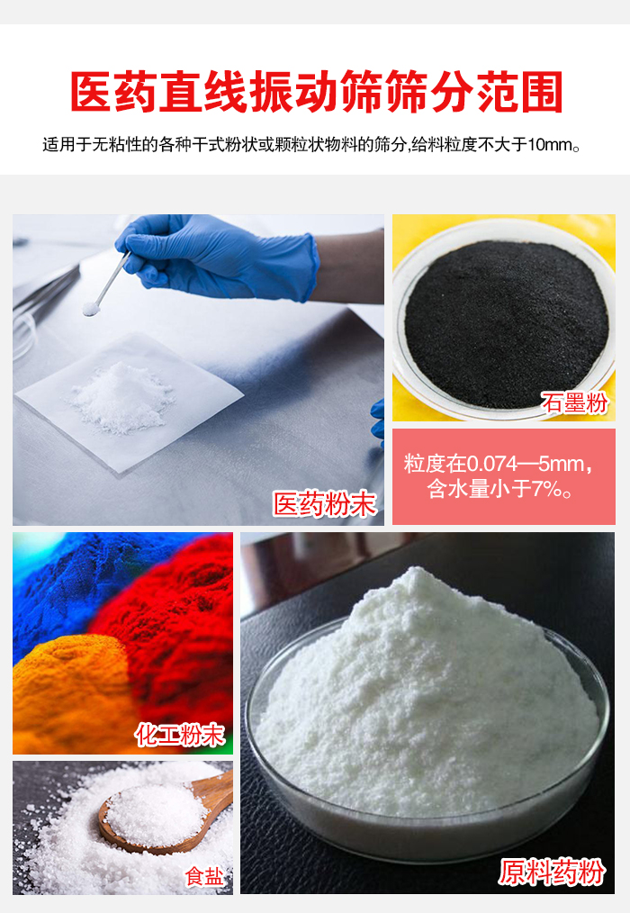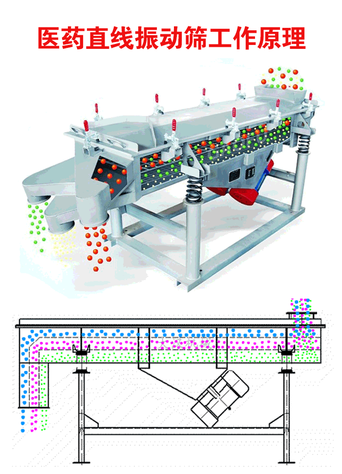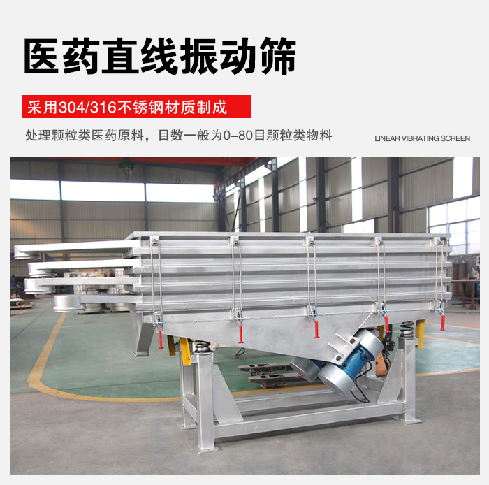 一般處理顆粒類醫藥原料,目數一般為0-80目顆粒類物料,主要在于該設備的動力源是兩臺同激振力大小的反向臥式振動電機同時作用,因此在縱向的激振力相互抵消,而水平方向的激振力相互疊加,再加上物料自身的重力作用,在其合力方向也就是直線篩篩面水平方向,物料做直線跳躍式前進運動。