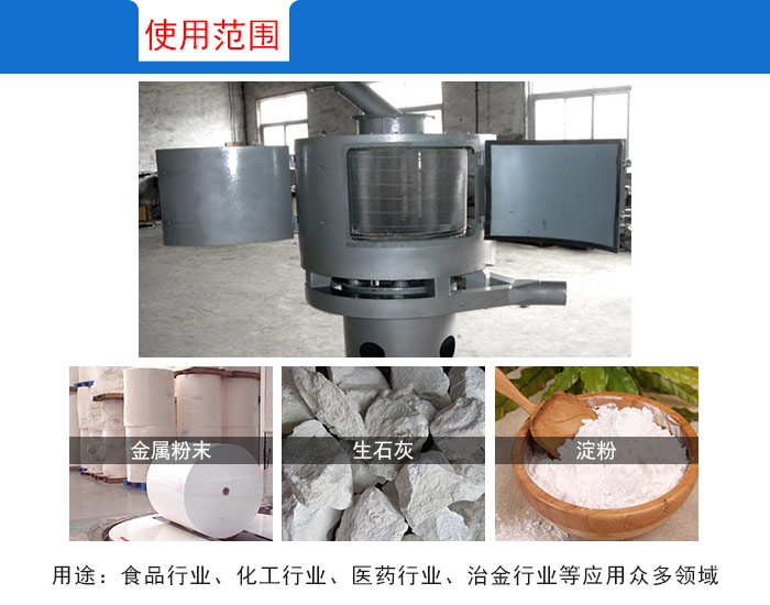 氣流篩廣泛應用于醫藥、化工、造紙、食品、冶金、建材等行業,非常適合粉狀物料的篩分,如:石墨粉、樹脂粉、中藥粉、涂料、粉煤灰、滑石粉、工業藥品、化妝品、滅火劑、塑料粉、陶土、研磨料、鋁粉等。