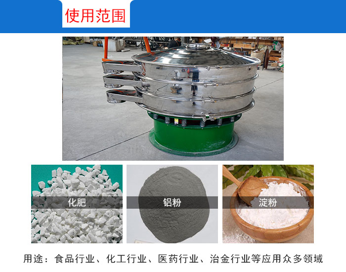 三次元振動篩廣泛應用于化工、食品、冶金、制藥等行業中各類各類顆粒、粉末、粘液狀物料的篩分和過濾,如:樹脂粉、顏料、洗衣粉、微粉、油漆、糖粉、淀粉、食鹽、鉛粉、鋁粉、合金粉、中藥粉等。